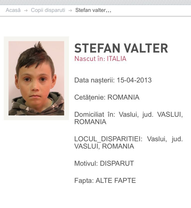 Autoritățile sunt în alertă după ce un copil în vârstă de 11 ani a dispărut luni, 3 martie, în timp se se afla într-o zonă centrală din municipiul Vaslui. A fost transmis imediat un mesaj prin sistemul RO-ALERT, iar oamenii legii au demarat căutările. Copilul se află în asistență maternală și a dispărut din zona Teatrului de Vară. Ștefan Valter are o înălțime de aproximativ 145 cm, cântărește în jur de 40 kg, are părul scurt, șaten, și ochii căprui. În momentul dispariției, purta o geacă grena, pantaloni negri și un fes verde. Autoritățile fac apel către cetățenii care pot oferi orice informație ce ar putea contribui la găsirea copilului, să apeleze numărul de urgență 112.